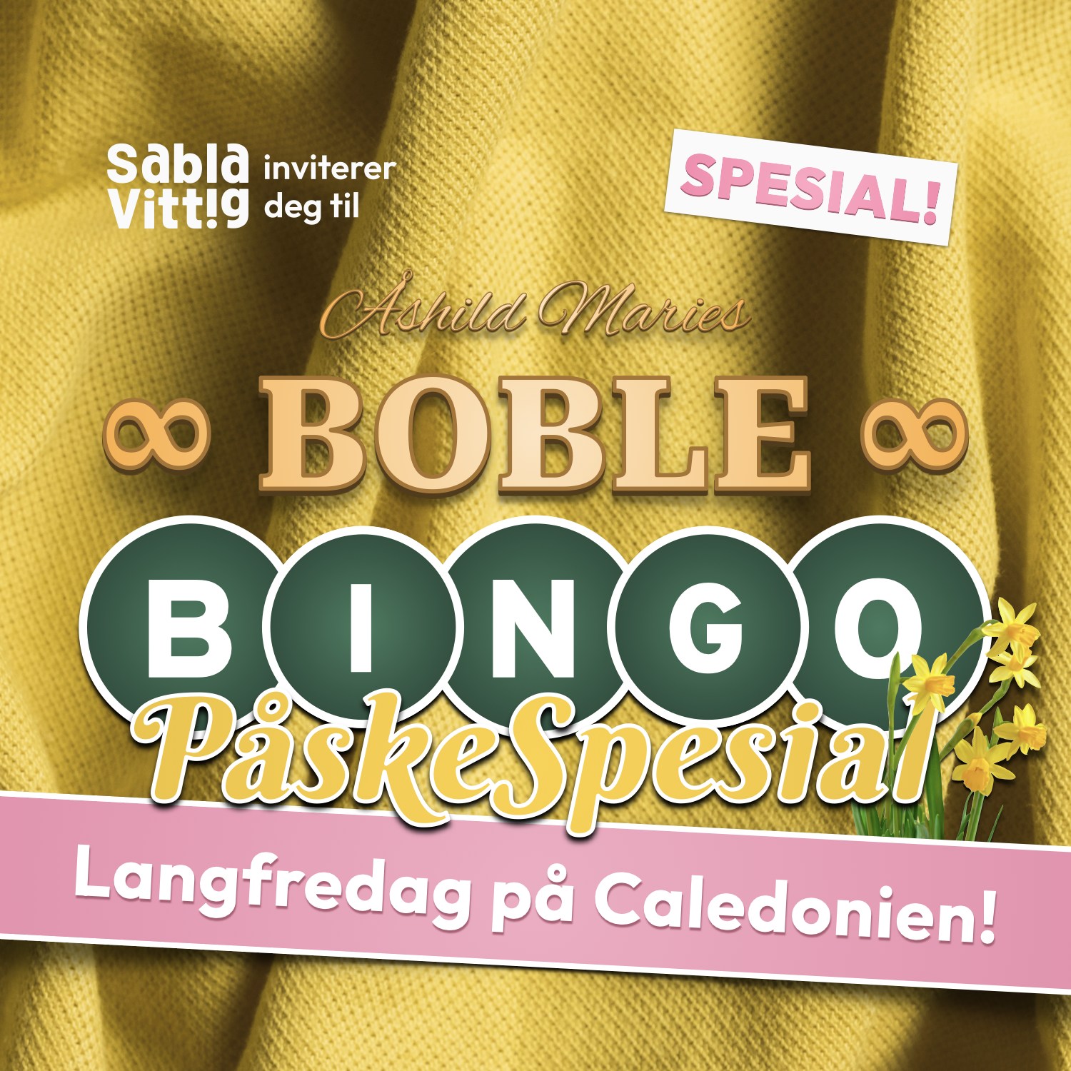 Sabla Vittig inviterer til Boble-bingo Påskespesial på Caledonien på langfredag. Bli med på denne elleville bingoen!